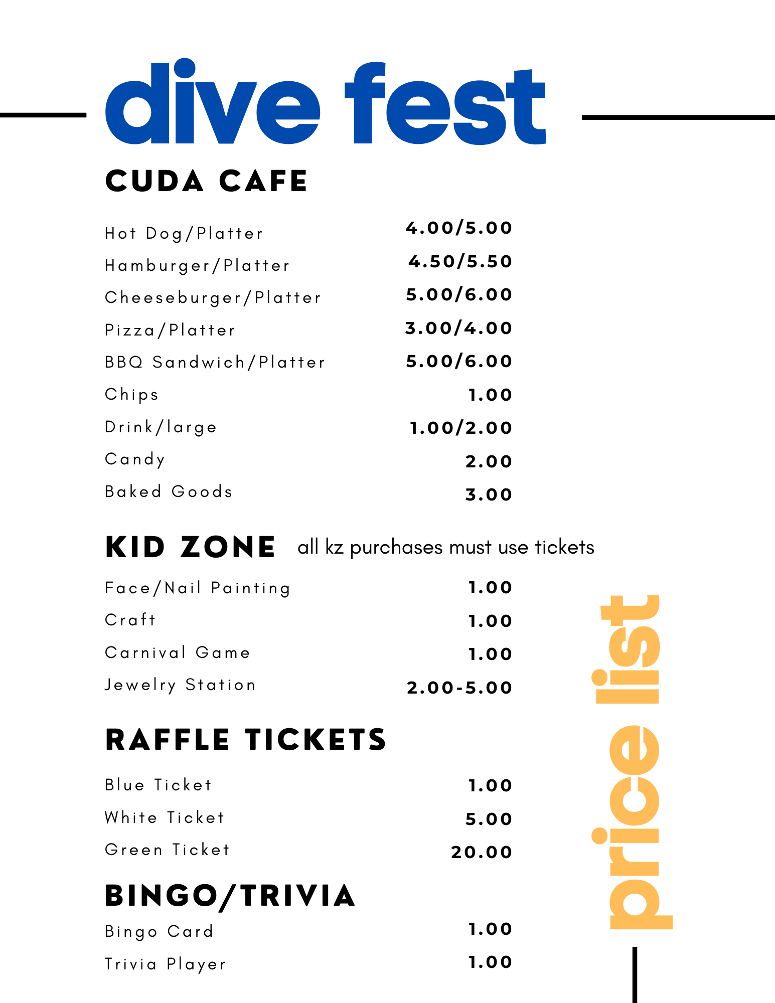 All purchases can be made at the Cuda Cafe with cash or credit. Raffle tickets can be purchased at the raffle tables (cash only). Tickets will be used to enter raffles and as currency in the kid zone. Food can be purchased with cash or with chip/contactless cards. Bunnyman purchases can be made with card only.